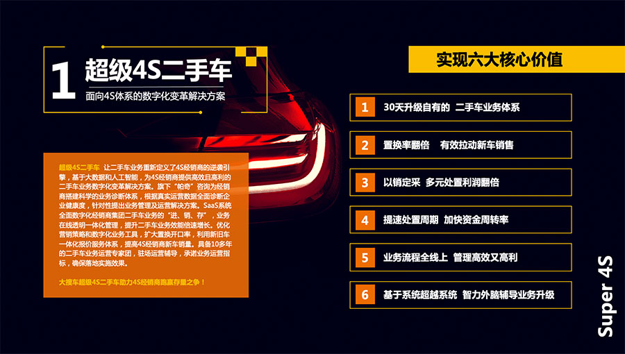 車(chē)易拍聚合大搜車(chē)的SaaS服務(wù)能力和車(chē)易拍的在線拍賣(mài)交易能力,搭建了以拍賣(mài)交易為核心的二手車(chē)數(shù)字化供應(yīng)鏈服務(wù)平臺(tái),為二手車(chē)買(mǎi)家、賣(mài)家、檢測(cè)服務(wù)商、車(chē)務(wù)服務(wù)商等各個(gè)生態(tài)伙伴提供基于SaaS產(chǎn)品的業(yè)務(wù)數(shù)字化變革解決方案。拍賣(mài)生態(tài)伙伴基于SaaS產(chǎn)品實(shí)現(xiàn)業(yè)務(wù)在線和數(shù)據(jù)協(xié)同,形成行業(yè)聚合的數(shù)據(jù)共享和社會(huì)化服務(wù)能力共享,共同打造高效的二手車(chē)在線交易能力及服務(wù)體系。