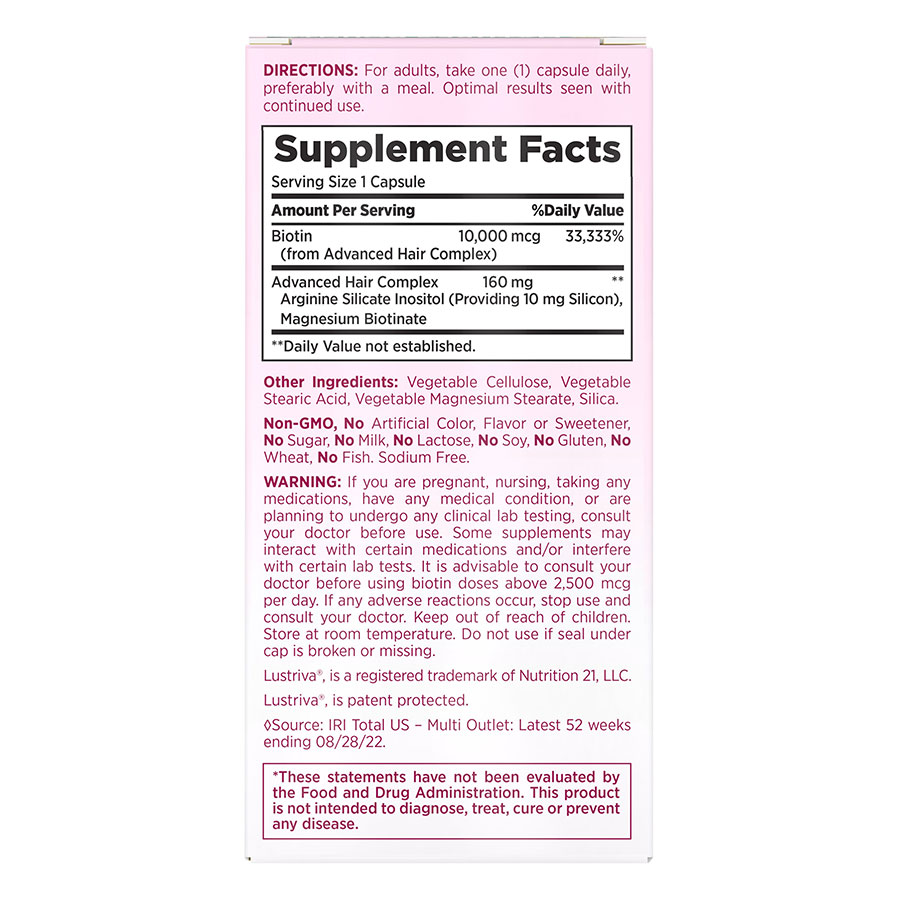 自然之寶密發(fā)膠囊針對有脫發(fā)困擾,需快速改善頭發(fā)問題的女性,非轉基因,不含人工色素、不含人工香料、不含人工甜味劑。含三大核心營養(yǎng)素:生物素、硅、精氨酸,每粒含10,000 mcg生物素,和10,000 mcg硅,更易被人體吸收利用。
