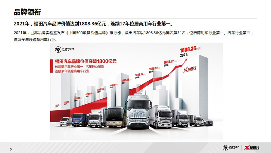 北汽福田汽車股份有限公司(簡稱福田汽車)成立于1996年,1998年在上海證券交易所上市,是中國品種最全、規(guī)模最大的商用車企業(yè)之一,2021年品牌價(jià)值達(dá)1808.36億元,連續(xù)16年蟬聯(lián)中國商用車行業(yè)第一位。2021年,在福田汽車成立的第25周年,總銷量突破1000萬輛,成為中國汽車工業(yè)史上首個銷量突破千萬輛的商用車企、中國首個千萬級“雙自主”商用車企、全球突破千萬銷量用時(shí)最短的商用車企。海外累計(jì)出口65萬輛,連續(xù)10年位居中國商用車出口第一,產(chǎn)品覆蓋全球110個國家和地區(qū)。