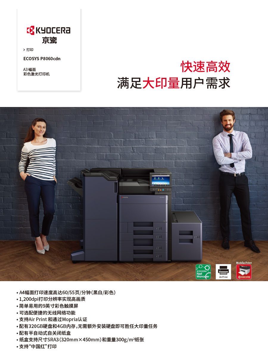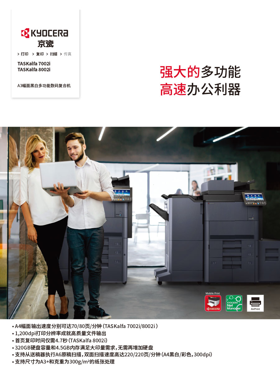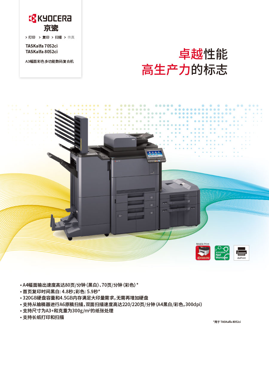 主要產(chǎn)品:KYOCERA京瓷激光打印機(jī),一體機(jī),復(fù)合機(jī),生產(chǎn)型彩色噴墨數(shù)碼印刷系統(tǒng)及辦公信息系統(tǒng)的開發(fā)、設(shè)計、系統(tǒng)集成