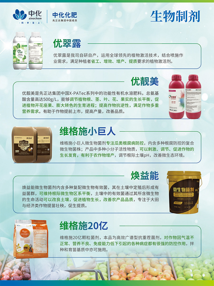 美麟美、麟葆等生物磷肥由中化化肥與中國農(nóng)業(yè)科學(xué)院聯(lián)合研發(fā),中化化肥獨家經(jīng)營,目前已升級為第三代產(chǎn)品,其“信號誘導(dǎo)促根”科技為全球獨創(chuàng),榮獲“中國增效肥料優(yōu)秀品牌“稱號藍(lán)麟是中化化肥聯(lián)合先正達(dá)研制的致力于高端經(jīng)作提質(zhì)抗逆的全水溶功能復(fù)合肥,是具有全水溶、速效性、長效性、增效性的尖端科技產(chǎn)品。