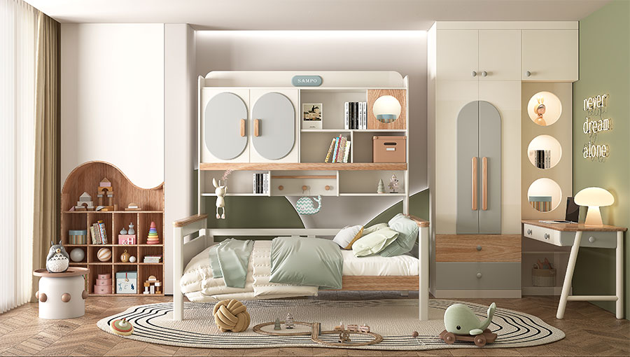 松堡王國圍繞孩子成長居家生活四大基礎(chǔ)功能:學(xué)習(xí)區(qū)、收納區(qū)、娛樂區(qū)、睡眠區(qū),深度交合孩子成長方式,以美學(xué)設(shè)計(jì)、親子陪伴、趣味模塊為新空間設(shè)計(jì)概念,正向引導(dǎo)孩子建立良好生活習(xí)慣,形成成長生活秩序感,用愛為孩子打造有趣的成長空間。