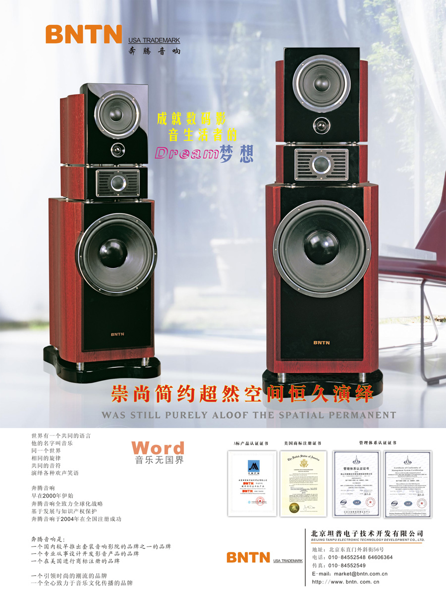 北京坦普電子技術(shù)開發(fā)有限公司是一家專業(yè)從事家庭影院設(shè)計、開發(fā)、銷售的公司,其主打品牌BNTN奔騰音響(中國中文注冊“萬馬奔騰”)是國內(nèi)較早推出套裝音響影院的品牌之一。